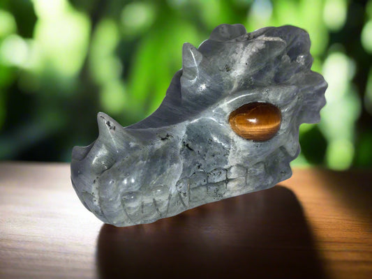 4.1" Labradorite Dragon Skull w/ Orange Chatoyancy & Tiger Eye Eyes